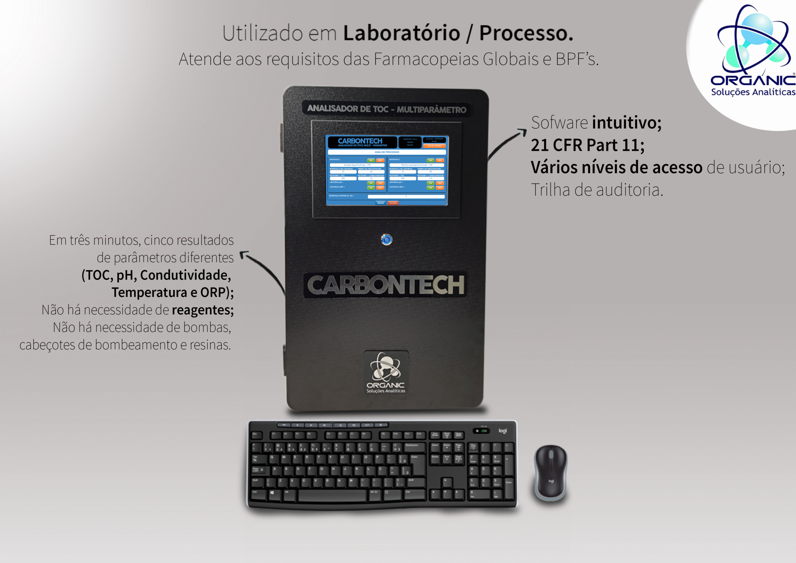 Análise simultânea de TOC, Condutividade, Temperatura, pH e ORP. Recursos exclusivos e inovadores que otimizam os processos analíticos físico-químicos, proporcionando uma significativa redução no tempo necessário para a liberação de água para a produção, atendendo às exigências das farmacopeias e BPF com eficiência e confiabilidade.