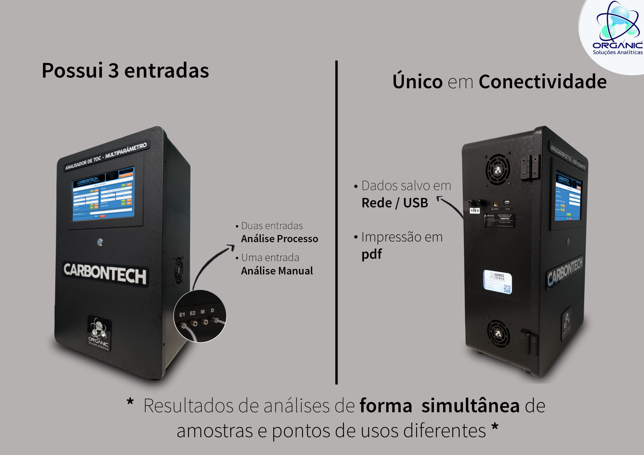 pontos, com dois pontos simultâneos online e um ponto para amostra manual. Diferente de outros equipamentos no mercado, o CarbonTech possui três entradas de amostra, possibilitando eficiência:
